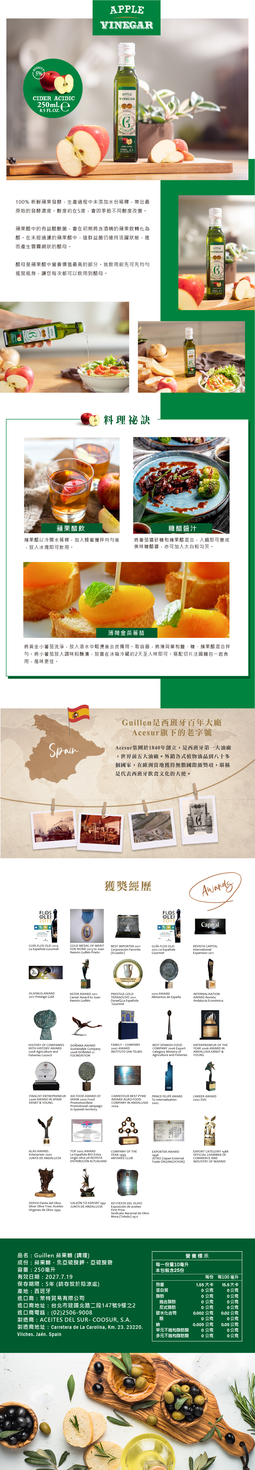 100% 新鮮蘋果發酵生產過程中添加水份釋,帶出最原始的發酵濃度酸度約在5度 (因季節不同酸度不同)蘋果醋中的有益醋酸菌,會在初期將含酒精的蘋果飲轉化為醋在未經過濾的蘋果醋中,這群益菌仍維持活躍狀態,進而產生雲霧網狀的醋母醋母是蘋果醋中營養值最高的部分,飲用前先可先均勻搖晃瓶身