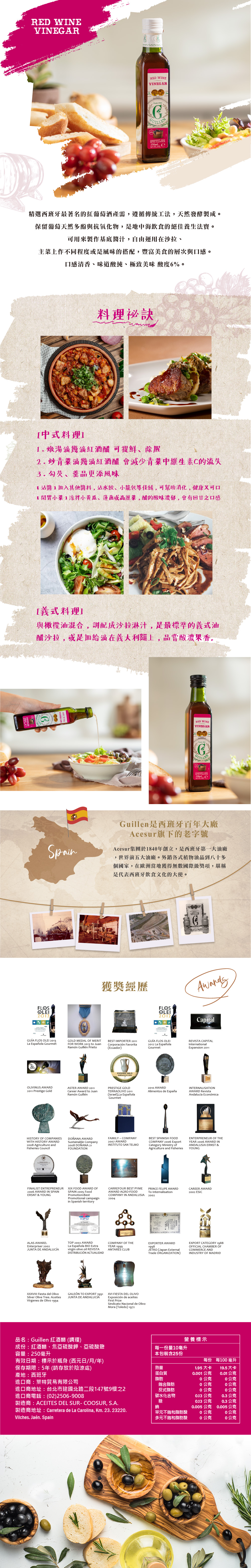 精選西班牙最著名的紅葡萄酒產需,遵循傳統工法,天然發酵製成。保留葡萄天然多酚與抗氧化物,是地中海飲食的絕佳養生法宝可用來製作基底醬汁,自由運用在沙拉主菜上作不同程度或是風味的搭配,豐富美食的層次與口感口感清香、味道酸純、極致美味