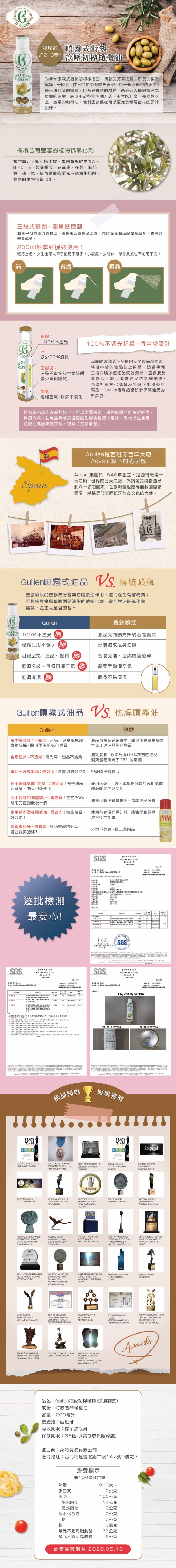 【Guillen】噴霧式特級冷壓初榨橄欖油 200ml